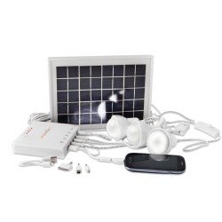 - Le kit solaire nomade autoconsommation à 3 ampoules avec batterie lithium-ion 4,4 Ah et plusieurs câbles Android et iOS pour recharger vos smartphones, iPhone, iPad, etc.
