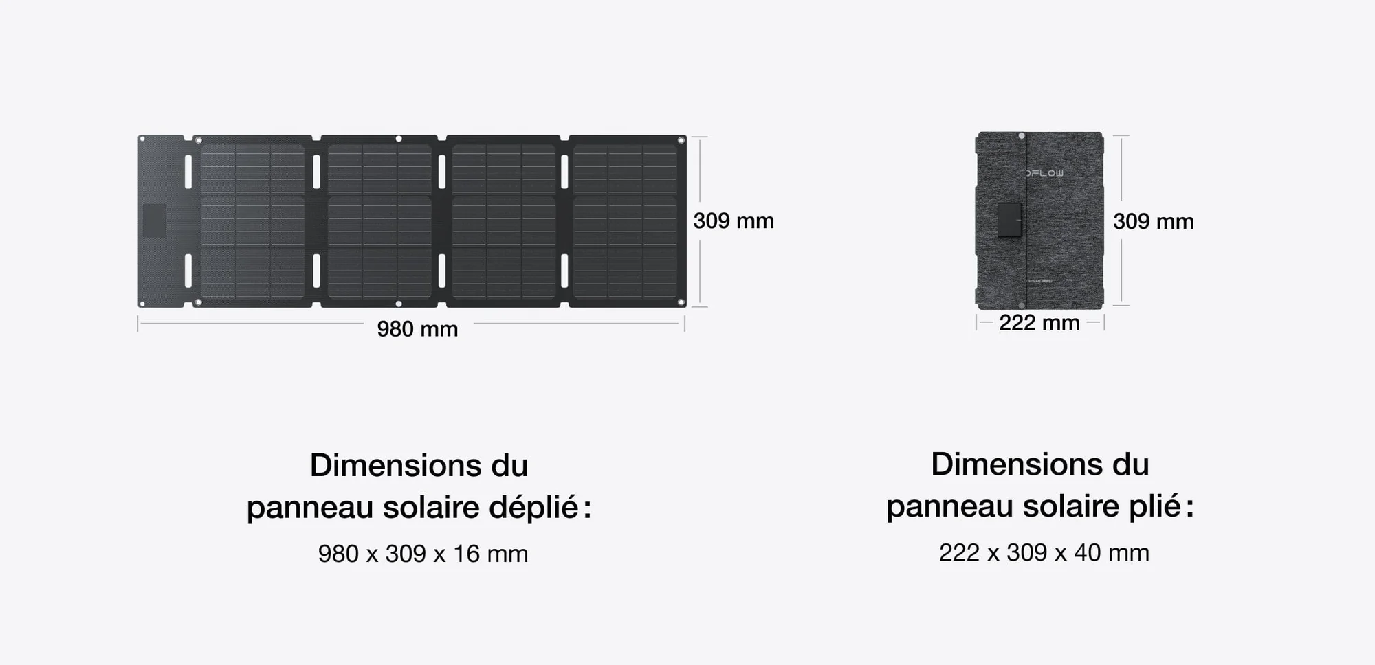 Le Panneau Solaire Portable EcoFlow 45W est conçu pour être léger et peu encombrant. Plié, il ne mesure que 222 × 309 × 40 mm, soit la taille d’un ordinateur portable, ce qui le rend facile à ranger et à transporter. Format pliable en quatre parties pour un encombrement réduit. Le panneau solaire portable 45W monocristallin 12V ou USB Ecoflow se glisse facilement dans un sac à dos, un SUV ou une minifourgonnette. Le Panneau solaire portable 45W monocristallin 12V ou USB Ecoflow est idéal pour une installation mobile et rapide sur tous types de terrains.