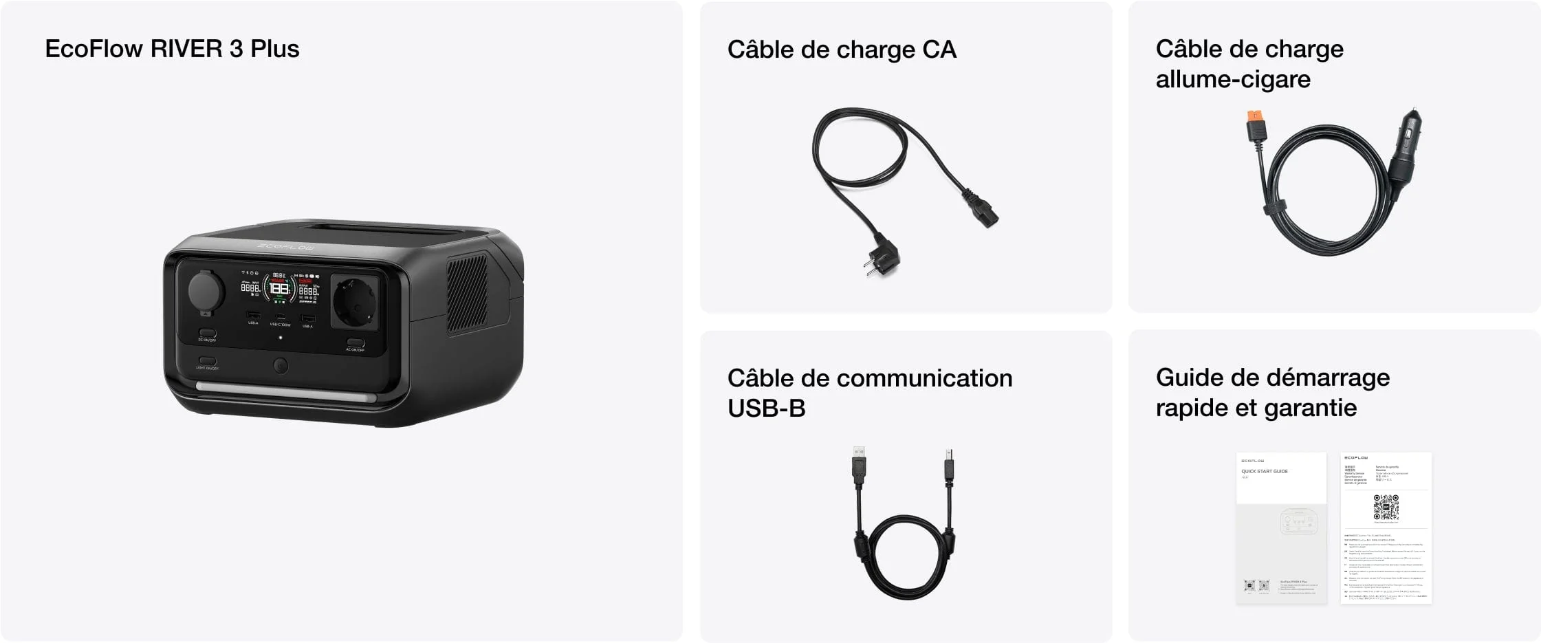 3 sorties, 600 W au total (1 200 W en crête, 1 200 W avec X-Boost) 2 ports, 5 V ⎓ 2,4 A, 12 W max. par port, 24 W au total |