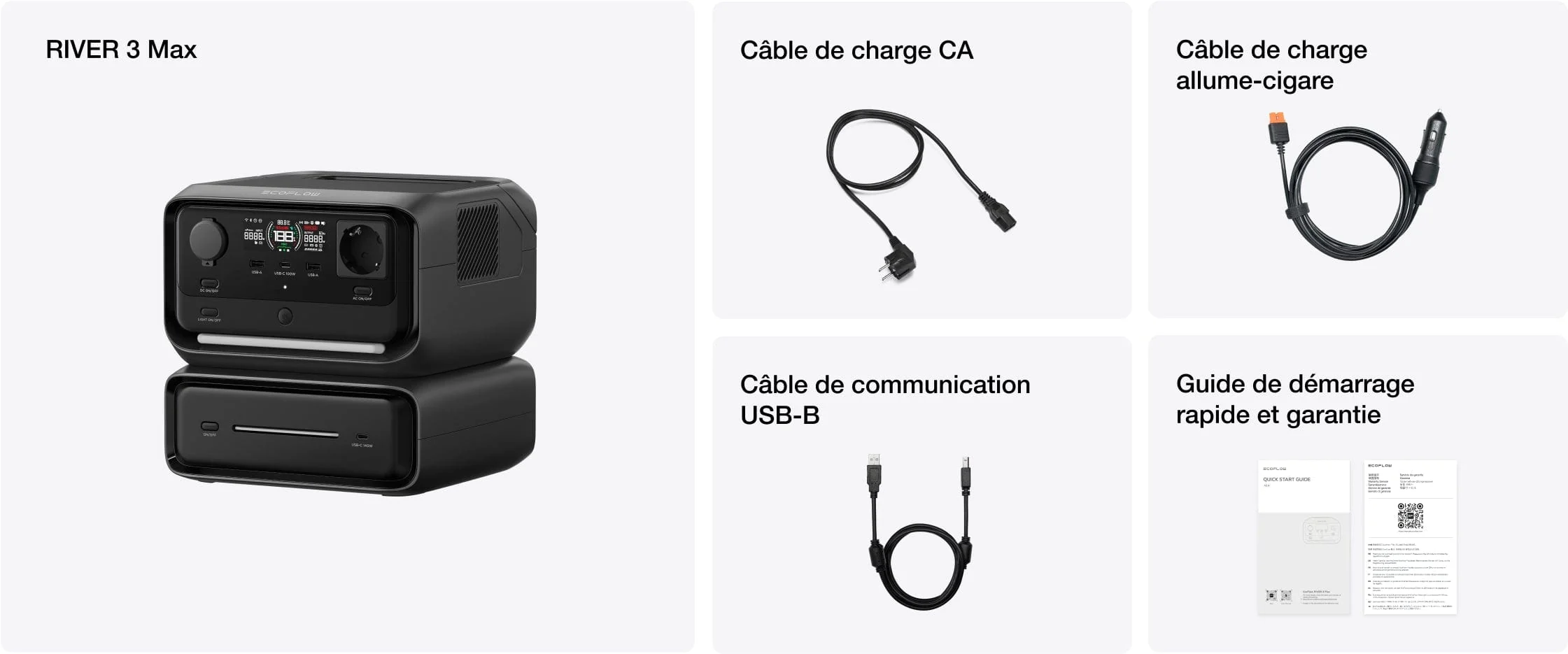 3 sorties, 600 W au total (1 200 W en crête, 1 200 W avec X-Boost) 2 ports, 5 V ⎓ 2,4 A, 12 W max. par port, 24 W au total |