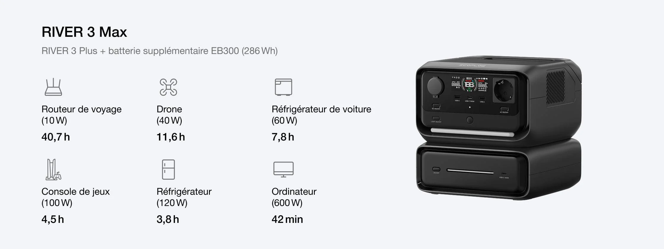 Avec sa capacité de 572Wh, la RIVER 3 Max vous offre une autonomie prolongée, tout en restant facile à transporter. Grâce à ses 3 000 cycles de charge, elle garantit une durée de vie exceptionnelle. Dotée de 600 W de puissance nominale (jusqu’à 1 200 W avec la technologie X-Boost), elle peut alimenter la majorité de vos équipements, même les plus gourmands en énergie.