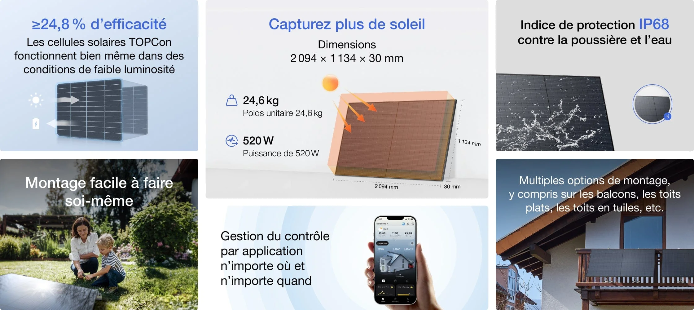 Grâce à son système de montage universel, ce panneau est adapté aux balcons, toits plats, toits en tuiles et même jardins. Aucun besoin d’un professionnel : son format plug & play permet une mise en place rapide, sans outils complexes ni compétences techniques.