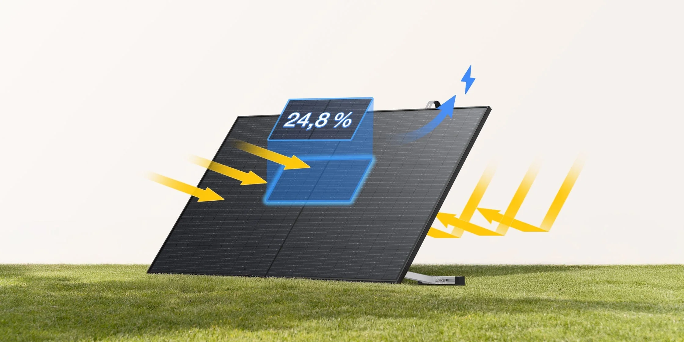 Le module EcoFlow affiche un rendement de 24,8 %, parmi les meilleurs du marché. Grâce à la technologie bifaciale, il capte la lumière solaire des deux côtés pour augmenter significativement la production d’énergie, même lors de conditions nuageuses ou en lumière indirecte.