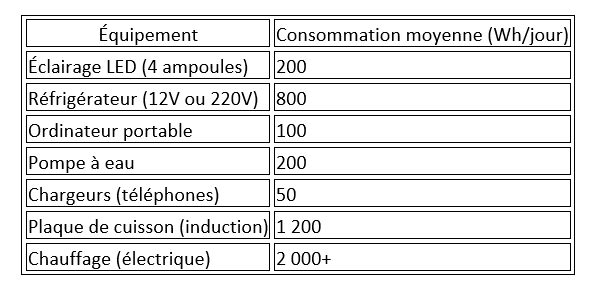 - Calculer vos besoins énergétiques : faites l’inventaire de vos appareils et de leur consommation journalière en Wh. Additionnez-les pour obtenir une estimation précise.