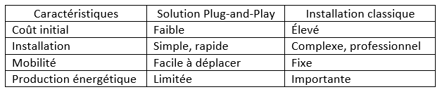 Est-ce que le panneau solaire à brancher sur une prise de courant électrique est avantageux par rapport à une installation d’autoconsommation standard ? Le tableau suivant compare les deux systèmes :
